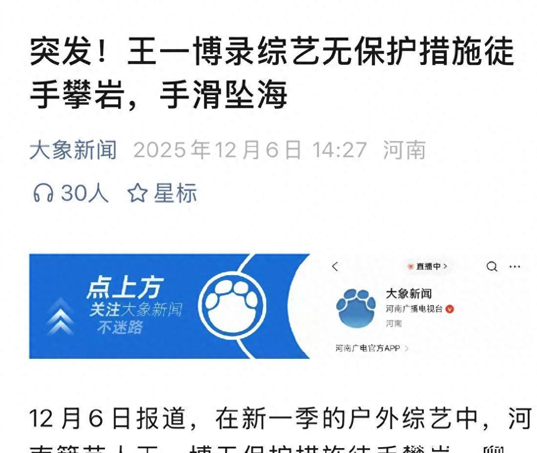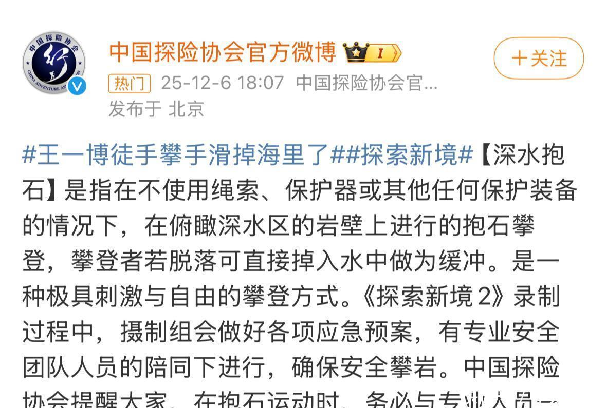 12月6日“王一博录制综艺恐怕坠海”的词条冲上热搜,网友都为他握一把汗。好多官方账号都在报谈他“坠海”、“徒手攀岩恐怕”的音尘,直到王一博发文报吉祥,公共才稳下来。