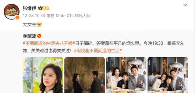 在新剧厚爱开播后,张维伊也转发了董璇的这条动态,配文是“大女主”。