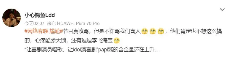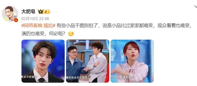 “让笑剧演员唱歌,让idol演笑剧”,仿佛成了本届网春的“创作铁律”。多半短剧演员、偶像明星跨界演小品,台词生硬、花式处理失控,直播时的鼎新参差更是一望宽广。