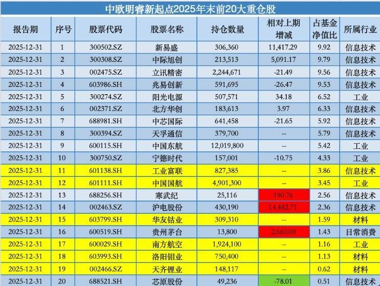 据最新暴露的年报数据,中欧明睿新最先在2025年下半年再行买回了工业富联(601138.SH)、华友钴业(603799.SH)、天皆锂业(002466.SZ),并初次建仓中国国航(601111.SH)、南边航空(600029.SH)、洛阳钼业(603993.SH)。