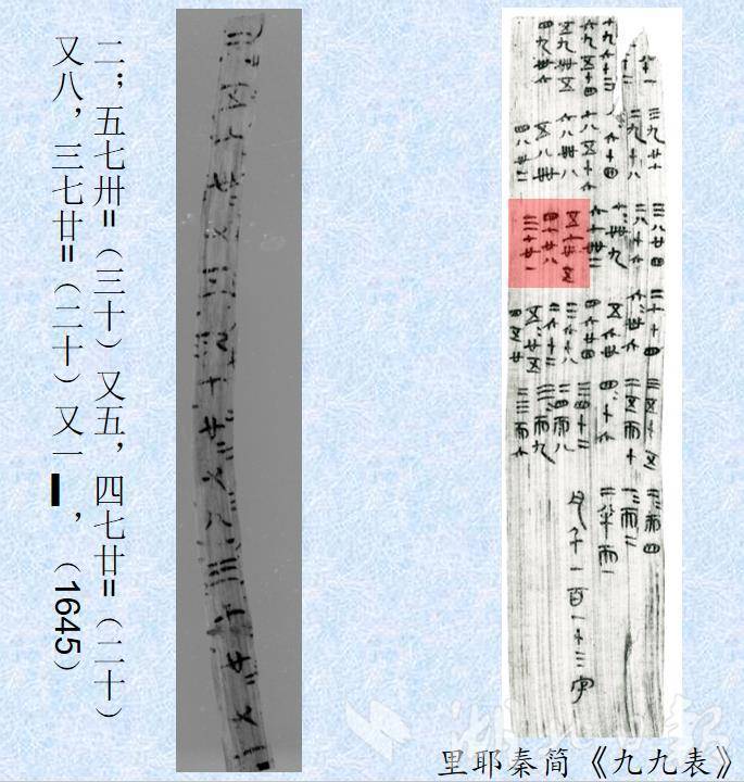 左为秦家咀M1093楚墓出土“九九术”简(图片开头:荆州博物馆)